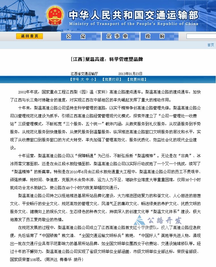 【中国交通运输部】梨温高速:科学管理塑品牌