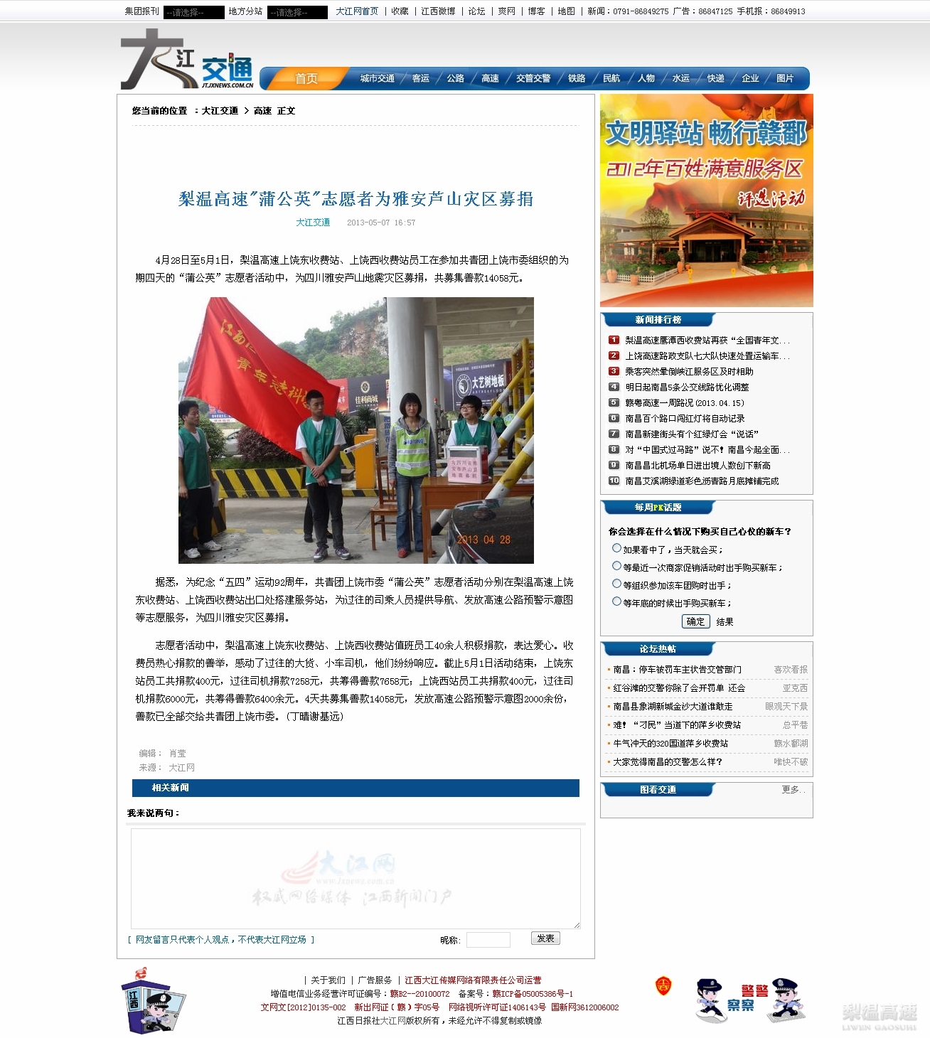 【媒体聚焦】梨温高速“蒲公英”志愿者为雅安芦山灾区募捐