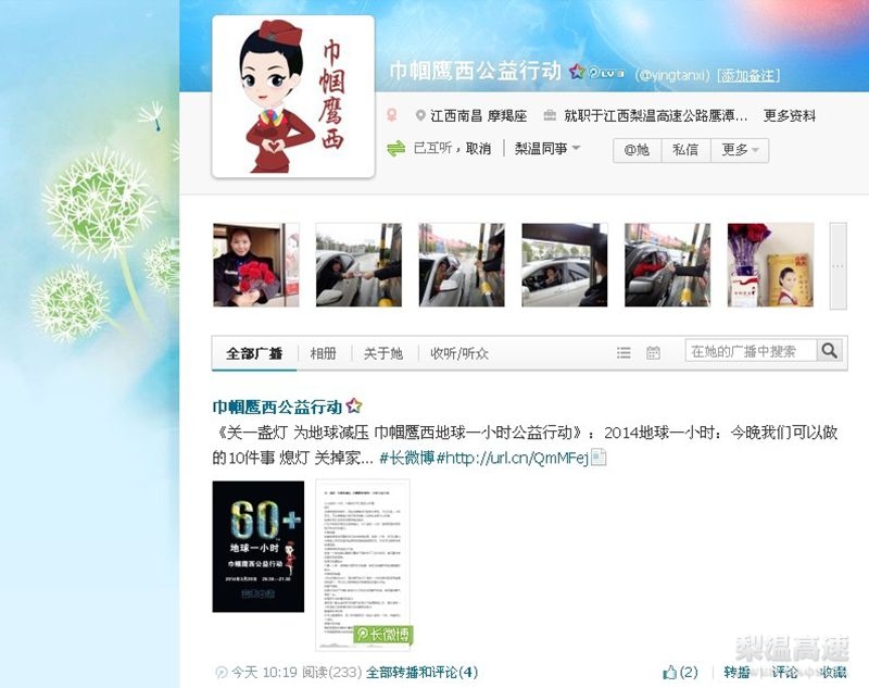 3月29日,梨温高速鹰潭西收费站为“地球1小时”开展公益活动。该站还通过微博、微信方式呼吁广大服务受众积极参与,共同为地球的明天贡献微薄之力。