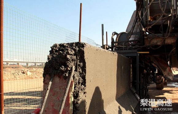 经现场测试,制作1米长防撞墙,该机器花了半个小时,外观整洁平顺,强度据称能达国标C40,较原先的C35标准提升一个等级。施工单位介绍说,传统制造设备一天最多生产100米防撞墙,该机器一天能生产300余米。此外,由于增加了四台传感器,控制机器全液压振动且自动调整,生产出的防撞墙外观平整精确度能够控制在1CM之内。目前该机型参与全国高速建设已有三年,技术日益成熟。