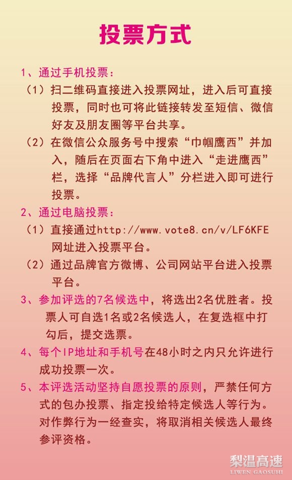 近日,梨温高速鹰潭管理处以网络为平台,面向社会开展“巾帼鹰西”服务品牌2015年度形象代言人网络评选活动。活动分为候选人征集、候选人精选、网络投票评选、选定品牌代言人四个阶段。日前,候选人征集、候选人精选阶段已经结束,2015年3月8日开始进入网络投票阶段。