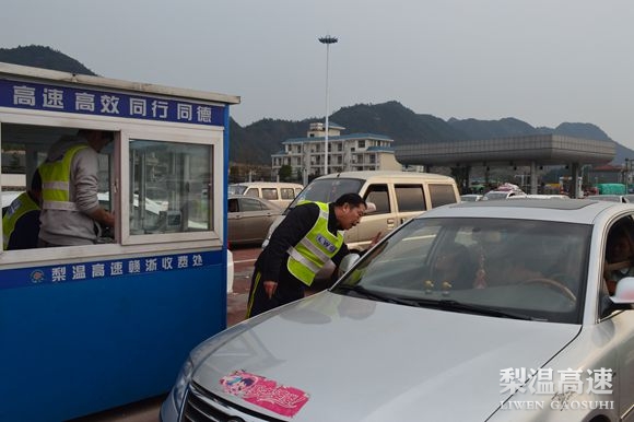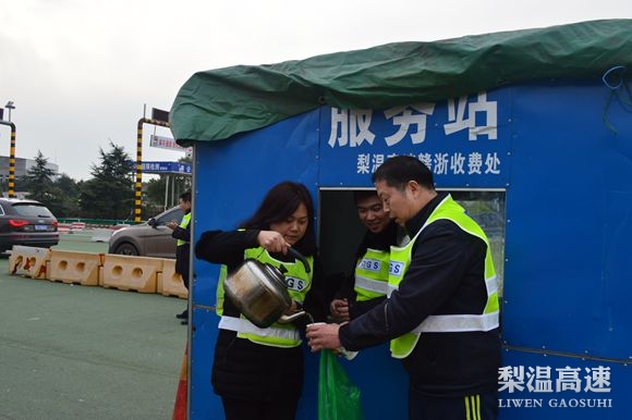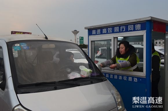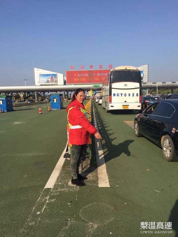 镜头三: 廖群,综合部人事劳资员,从梨温开通就扎根在梨园这个大家庭了。四十多岁的她看起来显得特别年轻,她平时总是爱笑嘻嘻的,但工作起来决不马虎,说一不二。在春运期间,她被安排在简易便携式岗亭里收费,那娴熟的业务技能,比起专职收费人员一点不逊色。所谓“台上一分钟,台下十年功”,这就是她平时经常下车道学习取经的成果,接卡、接钱、找零一气呵成,仅需3秒钟。每辆车驶来,她总是面带微笑重复着同样的话语:“你好,请交通行卡,请缴费,一路平安”。车主说到:“速度还挺快的吗?”她笑笑,快点好让你们尽快离开这呀。收费时,她经常一站就是四五小时不休息一下,口渴了就挨着水杯抿一下润润喉,腰酸了就自己捶捶,脚站酸了就动动,然后又继续她的收费工作,迎接下辆车的到来。