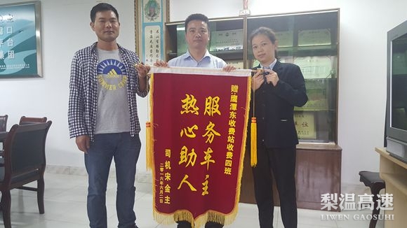 “谢谢你们,这样大的下雨天,车又坏在了高速路上,多亏你们的热心帮助,要不然真不知道怎么办,你们是高速活雷锋”,这是一位山东籍司机得到了梨温高速鹰潭东站工作人员的热心帮助后,送锦旗时的感激之言。