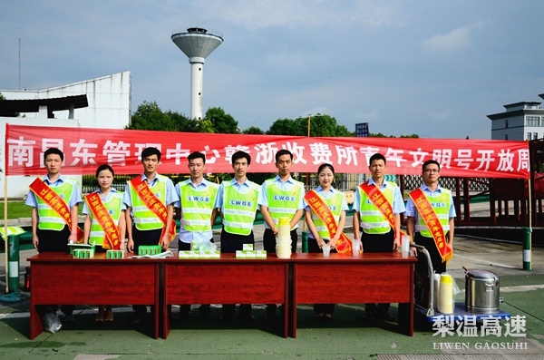 当天上午10点,青年志愿者们头顶着烈日,来到赣浙收费所梨园站收费广场边上,悬挂起横幅,整理好着装,摆放好正气水、风油精等防暑药品,推出绿豆汤、酸梅汤等清凉食品,等候着停车休憩的司乘。