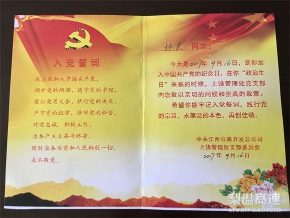9月16日,上饶收费所党支部向党员赠送了政治生日贺卡并祝福。这是该支部自开展党员政治生日活动以来,赠送的第二张贺卡。