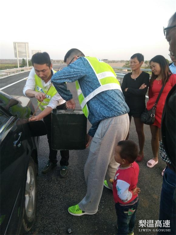值守人员立刻跑步向前了解情况,是一辆贵E牌照车辆全家要返回贵州,因车辆燃油已经耗尽无法行驶,万般无奈下来寻找加油站。天色已渐晚,面对着心急如焚的车主,还有车上的老人及小孩,现场情况十万火急。工作人员立刻向值班站长做了汇报,同时引导车辆和人员停在安全区域。值班站长安排人员和车辆就近加油站购买汽油,同时给司乘人员送来食物和矿泉水,对焦虑的司机进行必要地安抚。在大家共同努力下,司乘人员的情绪逐渐安定下来,车上的小孩也不再哭闹。