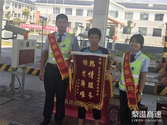 近日,浙江绍兴驾驶员陈立好将一面锦旗交到东昌高速桥东收费站义工联班组。