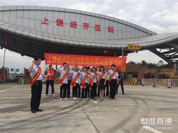 为积极推进星级收费站创建工作, 5月11日,梨温高速上饶经开区收费站全体员工在收费广场上举行了创建星级收费站宣誓活动。
