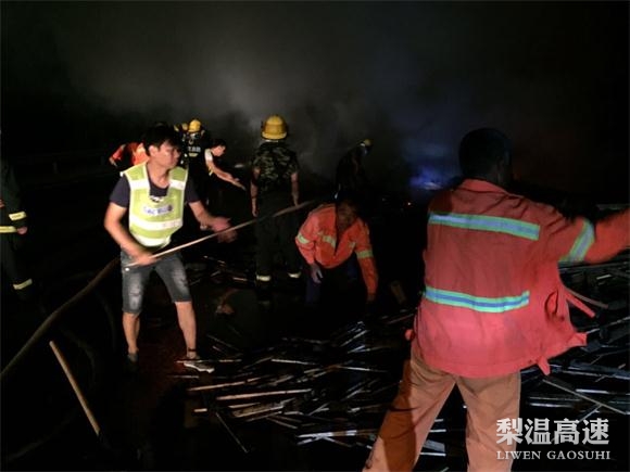 8月30日晚8时许,一辆满载木材的重型牵引挂车途径沪昆高速梨温段K542公桩往上海方向时因后侧轮胎起火引燃整车木材,导致该路段车辆无法通行情况十分危急。