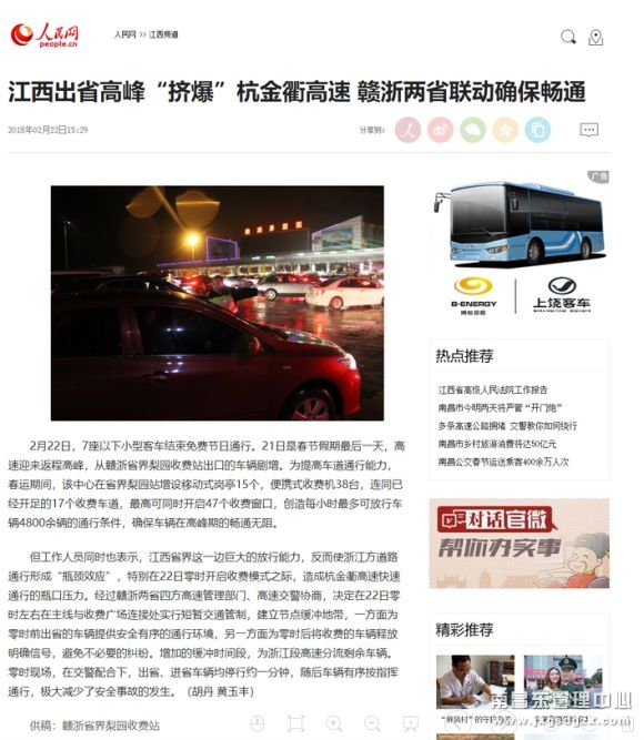 【媒体聚焦】人民网、中国江西网:江西出省高峰“挤爆”杭金衢高速 赣浙省界梨园站出口车辆达4.3万余辆