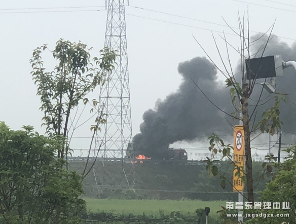 6月21日17时02分许,在东昌高速樟树东收费所往宜春方向K117+300公里处,一台油罐车在行驶过程中突然发生起火,造成车道阻断通行,如处置不当将随时可能发生爆炸。