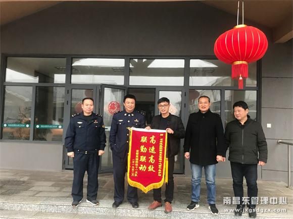 3月1日上午,高速路政宜春支队十一大队向新干养护站赠送来一面“ 高速高效 联勤联动”锦旗,表达在春运联勤联动保畅中无间配合。