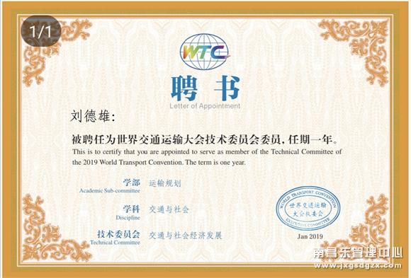 刘德雄同志被聘为“世界交通运输大会”技术委员会委员