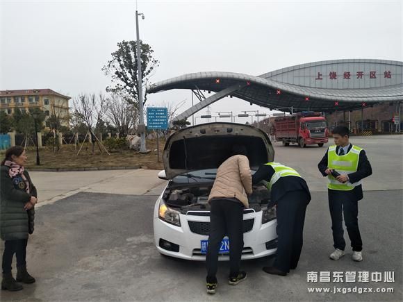 1月6日,一辆小车行驶至南昌南管理中心经开区收费站时,因车辆故障突然抛锚,收费站工作人员及时伸出援手,帮助司机脱离困境。