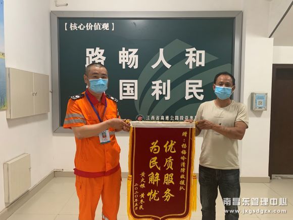 6月2日晚上10点多,赣C3B***的车主黄师傅将一面印有“优质服务,为民解忧”的锦旗送到了南昌南管理中心清障救援队徐志勇的手上。