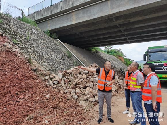 受近期强降雨影响,东昌高速K46+860左幅出现了边坡塌方,塌方量约500立方,形势严峻、安全第一,7月13日上午,南昌南管理中心总经理万良红前往水毁边坡点督导抢修工作,看望慰问奋战在现场一线的干部职工,督导指挥实施“保民房、保抢修、保畅通”养护工程。中心综合行政部、养护所相关负责人随同。