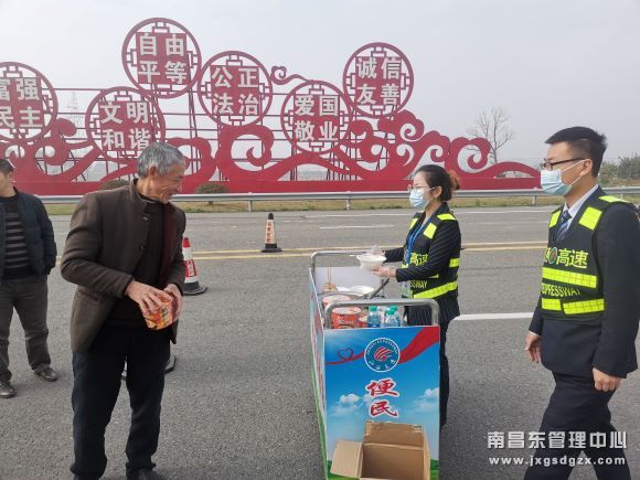 早上7时许,东乡西站便在收费广场上搭起了便民服务台,收费广场上出现了一群身穿反光背心的收费员,他们在大雾里穿行,有的为过往司乘人员做好疏导保畅工作。由于该站入口连接线较短,极易造成车辆拥堵,收费员耐心疏导各类车辆按照次序依次排队,避免解除管制时发生拥堵及剐蹭事故;有的为滞留的司乘人员送上热呼呼的面条、水饺、开水等,为司乘人员解决燃眉之急。
