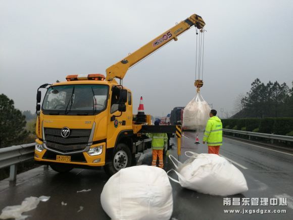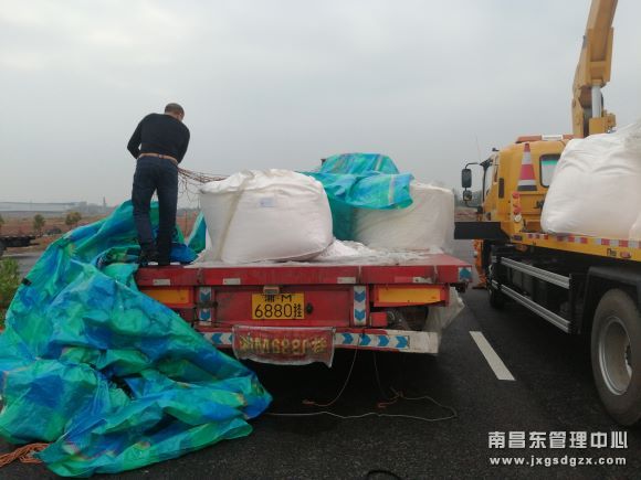 随后,在该队负责人的安排下,一名队员负责帮前面小型汽车更换轮胎,一名队员负责用遮雨布、盖住散落的货物,并用麻绳等物品将破口处堵住,其他人员负责用随车吊将货物吊至平板车上,经过了近40分钟的努力,终于将所有货物清理完毕,同彭师傅的车辆一起从贵溪收费站下高速。