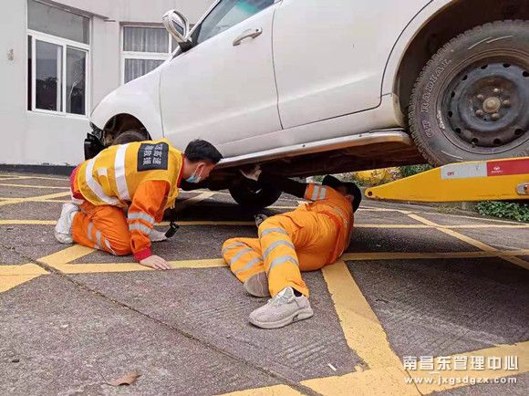 原来,在5月31日上午,该中队队员柴君和徐云峰正在鹰潭东收费广场卸车作业时,发现旁边停了一辆打着双闪灯的白色小汽车,司机在车旁左顾右盼,他们便立即上前询问是否需要帮助。司机李师傅立马告诉他们,他从余干来鹰潭办事,下高速后,车子不知压到了什么,现在无法正常往行驶,他已经检查了半个多小时都没发现问题,不知该如何是好。