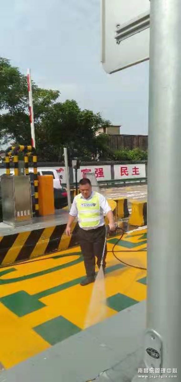 场景三:8点多的早晨,东乡收费所东乡站副站长付小华就在拿水枪冲洗车道啦,他一般两三天就会冲洗一次车道地面。你如果说,车道一冲洗完,马上车辆经过就会脏。他一定会憨厚地笑笑:“我们要让司乘人员有宾至如归的感觉,当然要畅洁绿美。”