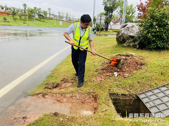 该站值班站长立即组织人员冒着大雨第一时间前往积水处。在观察了一段时间之后,值班站长发现这个地形有一处废旧的暗道,“如果把这个暗道疏通,那么积水应该会排出。”话刚说完,大家就拿起铲子,脚踩在淤泥里对暗道口进行疏通,最终经过大家的齐心协力,成功将积水和淤泥清理完毕。