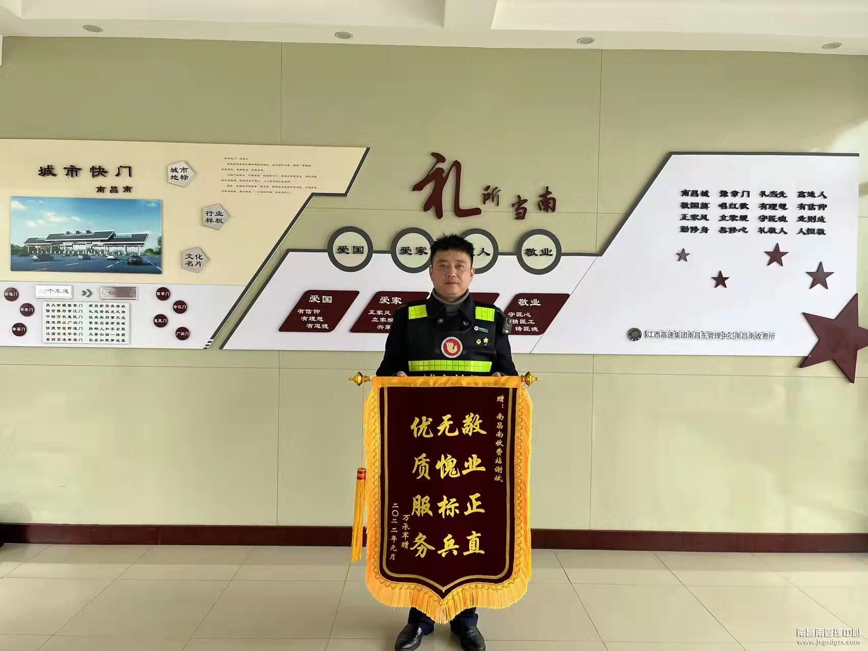 1月24日下午,南昌南管理中心南昌南收费站收到了驾驶员送来的一面印有“敬业正直、无愧标兵、优质服务”的锦旗,以此表达对该站负责人热情真诚服务的赞赏之情。