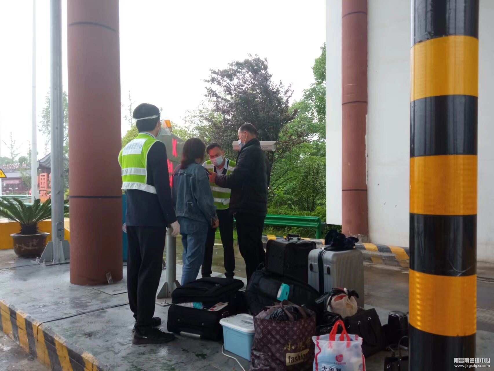 5月12日,南昌南管理中心弋阳收费站收费出口处,有一对中年夫妻提着行李向该站寻求帮助。