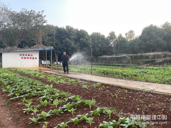 “你看这菜长得多好啊,绿油油的一片,现在我们可以吃到自己种的劳动成果了!”只听手里正忙着浇水的进贤站副站长付小华乐呵呵地说道。