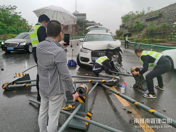 4月24日,在南昌南管理中心上饶东收费广场道路中央,一辆小车因车速过快撞上护栏板,车辆被卡在道路中间动弹不得,收费站几名工作人员赶紧清理事故现场,保证道口畅通安全。