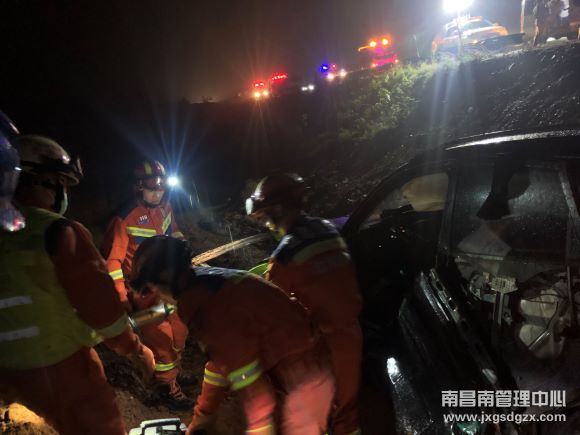 据悉,当天晚上18点20分余江中队值班人员接到路过司机的求助电话,称有一辆黑色小车冲出护栏滚下了边坡,司机情况危急,了解情况后,他们便立即组织人员和设备前往现场。