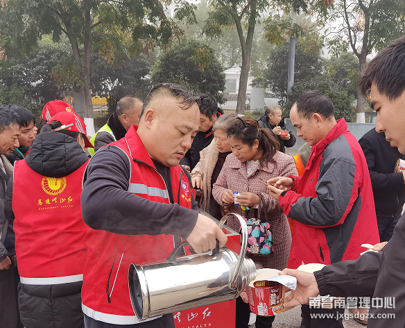 该站一方面组织员工安抚滞留司乘人员的情绪,解释封路的原因,提醒大家可通过关注江西高速微信公众号随时查询路况信息,另一方面准备了面包、稀饭、方便面、开水等丰富的早餐为司乘人员提供。