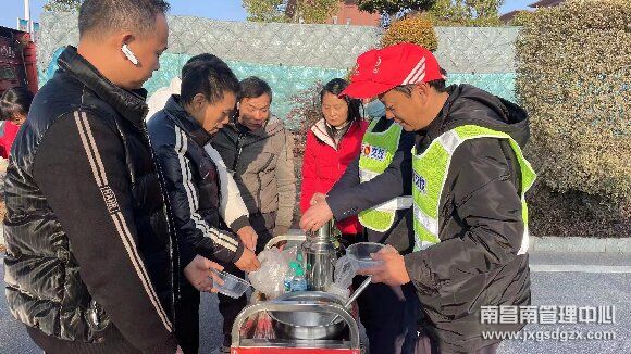 工作人员为滞留的司乘人员送上了热气腾腾的面条和热水,以实际行动缓解他们因滞留产生的不满情绪。