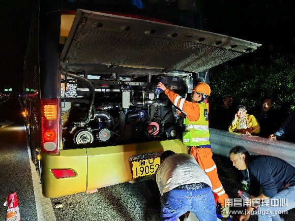 当晚19点35分,南昌南车辆救援大队杨梅岭中队接到报警电话,沪昆高速K535上海方向一辆满载55座的大巴因水箱缺水发生故障,停在应急车道。中队值班人员第一时间联系上司机陈师傅,在与陈师傅沟通后初步判断是水箱缺水,导致车辆发动机过热发生故障。随即,救援人员拿出空的尿素桶以及宿舍生活所用的水桶装满水赶赴现场救援,并安排抢修车辆一同前往,预防车辆是其他故障。19点45分到达现场,救援人员立即做好安全围蔽,在检查车辆后确定故障是水箱缺水导致。