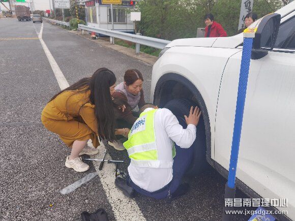 “能帮帮我们吗?我们的车子爆胎了,现在不知道怎么办。”4月17日,南昌南收费站入口广场一辆白色SUV因为爆胎停在了广场中央,随即当班工作人员也接到了车上司机的求助。