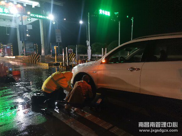 6月5日凌晨2点40分,天空下着大雨,南昌南管理中心南昌南收费站当班人员忽然发现一辆白色小轿车闪着应急灯,停在入口6道口不动了,收费员立马上前询问车主情况。