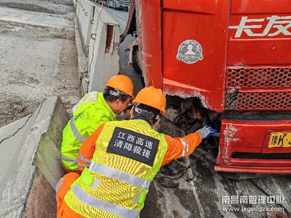 4月16日,南昌南管理中心南昌南车辆救援大队杨梅岭中队高效处置一起高栏货车撞新泽西墙事故,快速恢复现场通行,保障道路安全畅通。