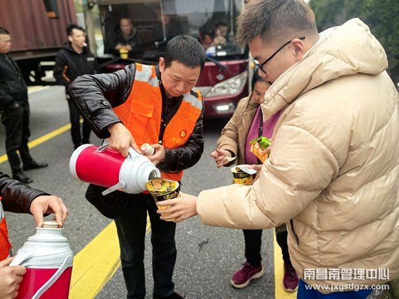 2月6日下午2点左右,南昌南管理中心东乡养护所技术员在道路巡查时,发现在梨温高速上饶段因春运返程车流量大造成拥堵,很多司乘人员滞留在高速路上没有吃饭,该所养护人员积极养护人员积极行动,为滞留司乘人员送去爱心简餐。