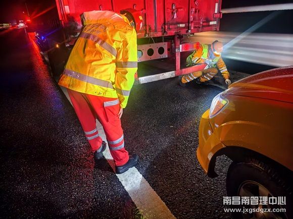 凌晨3时左右,一辆半挂车在沪昆高速K650南昌方向行驶途中,因气门漏气导致车轮抱死,车辆无奈占用行车道,情况万分危急。接到通知,余江中队迅速赶往现场,到达之后立即做好安全围蔽工作,保障现场安全。了解情况后,救援人员一边拿着手电筒,站在车辆后方,在雨幕中为来车方向的司机发出清晰的减速信号;一边为故障车司机照明,帮助司机更换气管。15分钟后,司机终于成功换好气管,车辆得以继续前行。