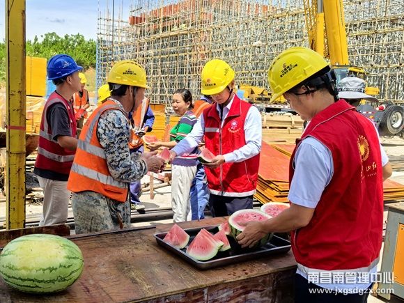 在施工现场,志愿者们将提前准备好的冰镇西瓜、矿泉水送到在一线施工人员的手中,让他们感受到丝丝清凉。收费站工作人员叮嘱施工人员,收费站备有藿香正气水、风油精等防暑物品,收费站食堂也经常会精心做各种防暑饮品,大家有需要都可以来找收费站帮忙。