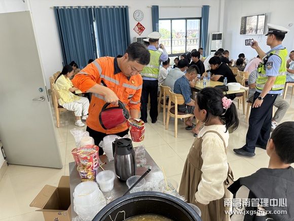 得知情况后,罗湖养护站迅速行动,第一时间赶到现场。为避免司乘人员在高温下中暑,该站工作人员当即将乘客引导至站内食堂,开启空调为大家降温解暑,积极安抚乘客们焦虑的情绪。当时正值早餐时间,该站值班人员考虑到不少乘客未吃早餐,立即安排人员到附近早餐店购买了热气腾腾的包子、牛奶、油条、方便面、油饼、矿泉水等物品,食堂也迅速烧水、下锅煮面,贴心地为司乘人员送上丰盛可口的美味早餐。