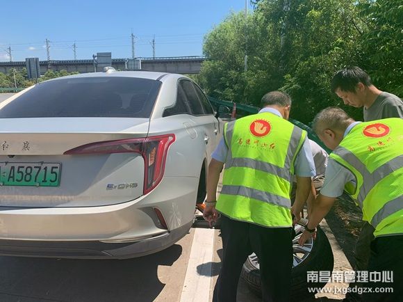 8月26日上午,在南昌南管理中心冈上收费站出口广场,一辆小轿车因爆胎停靠在护栏边,收费站工作人员热心相助,为车辆换胎、充气排除故障,帮助司乘平安顺利出行。