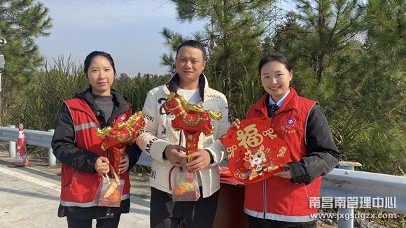 “提前祝您新年快乐!”岁序更迭,万象更新。在南昌南管理中心杜市收费站广场,志愿者通过拓福、送福活动,将满载深情的新年祝福送给过往司乘,愿他们在新的一年平安顺遂。